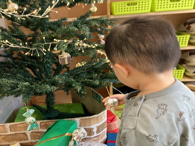 クリスマスツリーの準備をしていた先生を見て、(おうちにもある!!一緒だっ!!)と思ったのか、翌日こっそり鞄におうちのオーナメントを忍ばせて登園したお友だち・・・笑