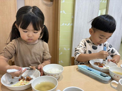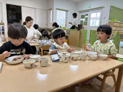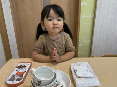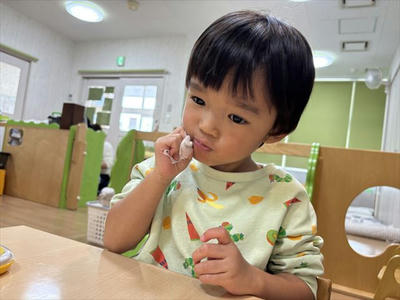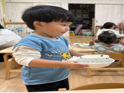 2歳児さんはお片付けもばっちり♪1歳児さんも巾着にスプーンセットを片づけたり、年齢別にできることをしています。自分でできたことがとっても嬉しいみたいです。子どもの持っている力を無理なく引き出せるような保育、言葉かけを行っています。