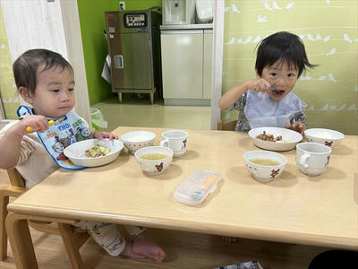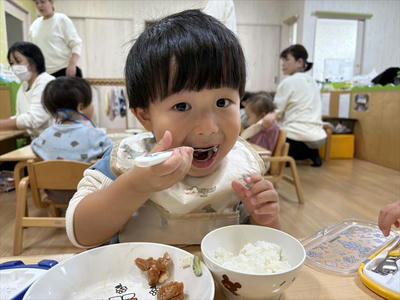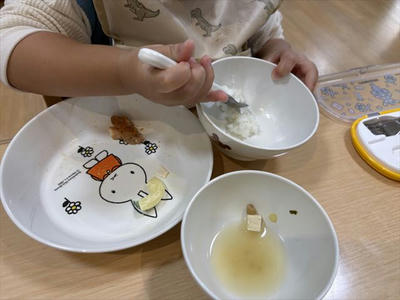 離乳食は一人ひとりの食材の摂取状況を栄養士と連絡を取り合いながら安全でおいしい給食を提供しています。アレルギー対応もしていてアレルギーのお子様も安心して食べられます。給食には乳、卵不使用になっています。