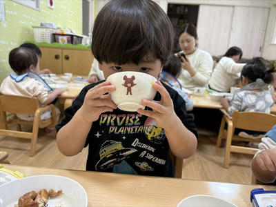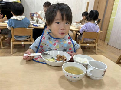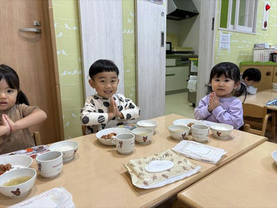 毎日給食が楽しみで、お家の方にメニューを聞いて、朝から「今日は〇〇だよ!」と楽しみにしている姿も見られます☆