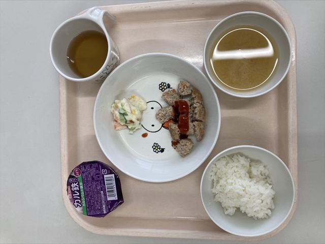 「ハンバーグ、ポテトサラダ、味噌汁、ごはん、ゼリー」