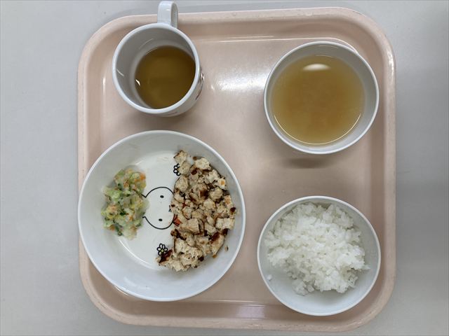 「鶏の甘辛焼き、マカロニサラダ、豆腐の味噌汁」