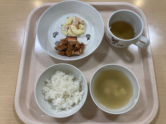 「鶏の甘辛焼き、マカロニサラダ、豆腐の味噌汁」