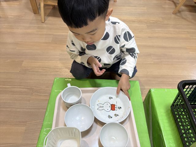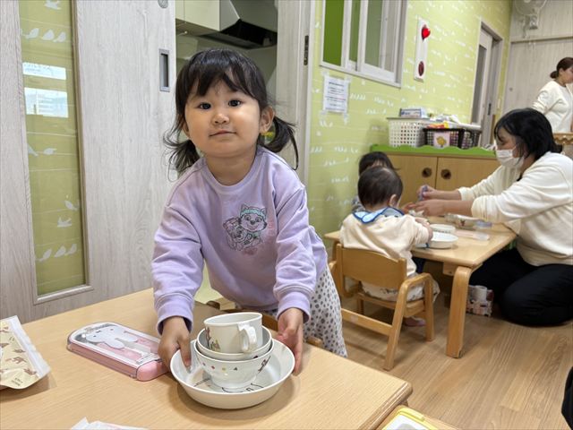 2歳児さんはお片付けもばっちり♪1歳児さんも巾着にスプーンセットを片づけたり、年齢別にできることをしています。自分でできたことがとっても嬉しいみたいです。子どもの持っている力を無理なく引き出せるような保育、言葉かけを行っています。