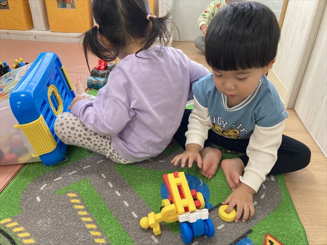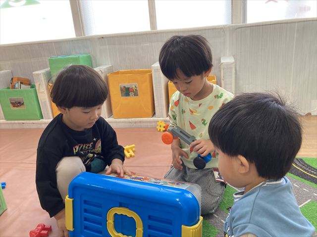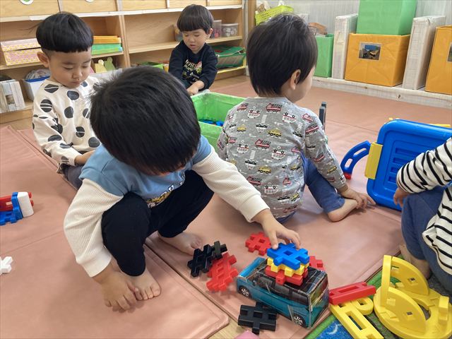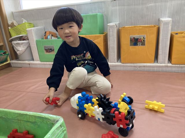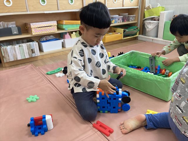 初めは「先生作って~」「くっつけられないよー」とおねだりしていた子どもたちも、今では自分たちで想像してオリジナルの作品が作れるようになりました。
